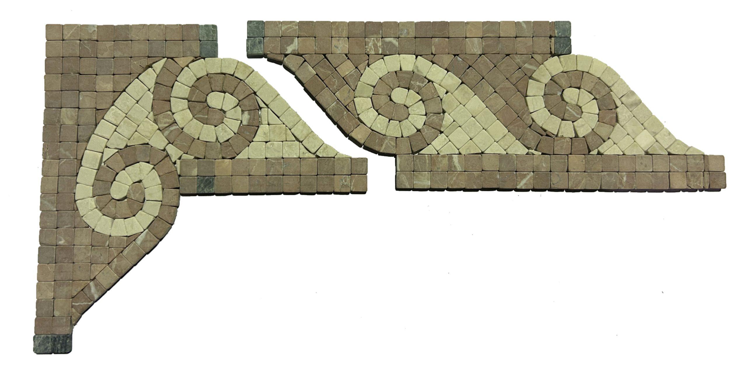 Cenefa de mármol blanco, rojo alicante y verde macael. Mod. ESQUINA BO 3R, Pegadas en malla de 15x15cm. Grosor de 0,7cm. Acabado natural, poro cerrado. Precio por pieza