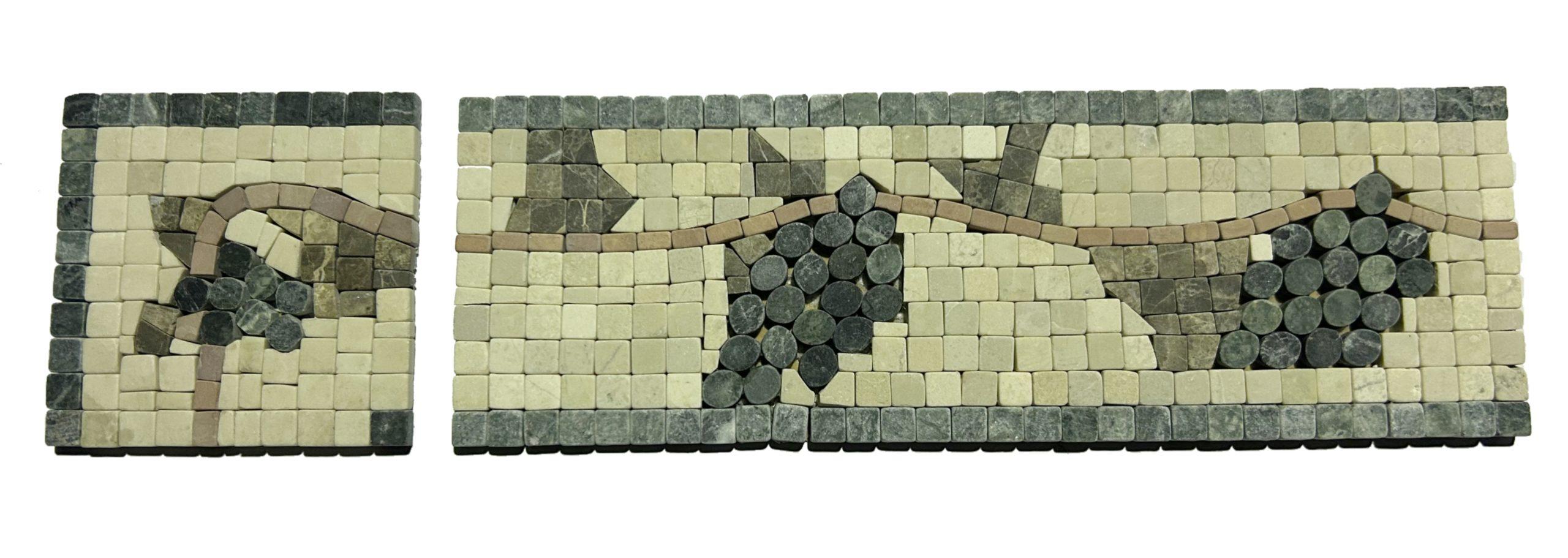 Cenefa de mármol blanco, verde macael, rojo alicante y marrón emperador Mod. ESQUINA HERA, Pegadas en malla de 10x10cm. Grosor de 0,7cm. Acabado natural, poro cerrado. Precio por pieza
